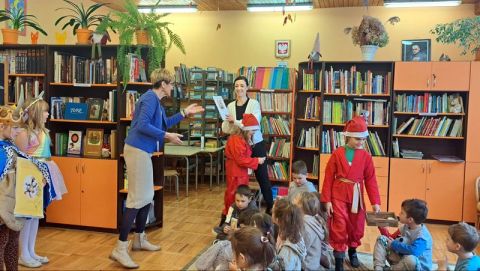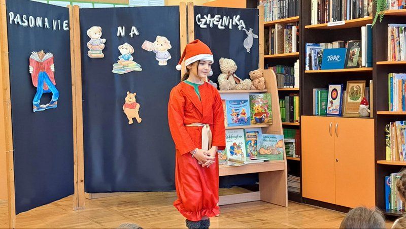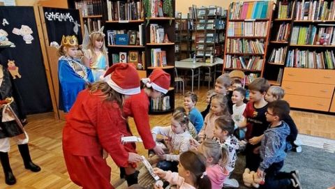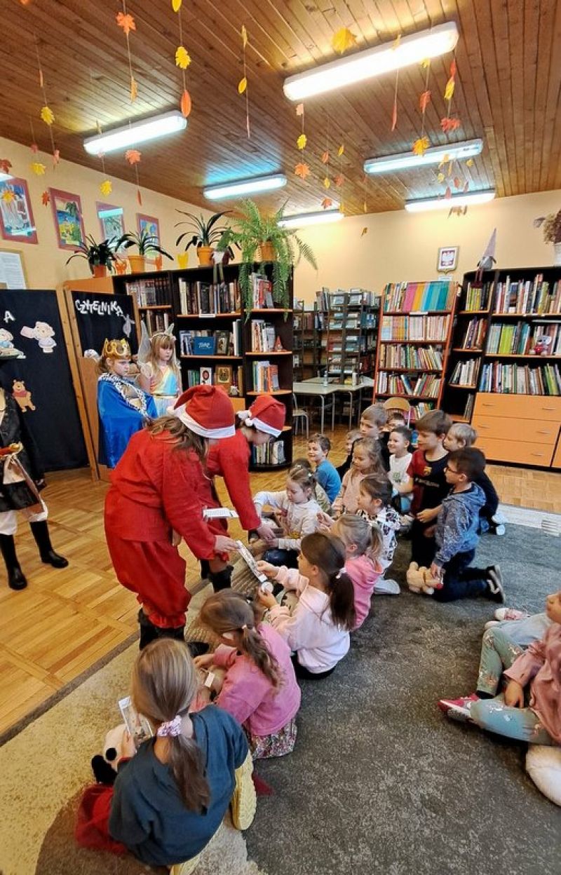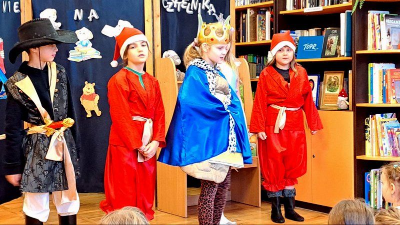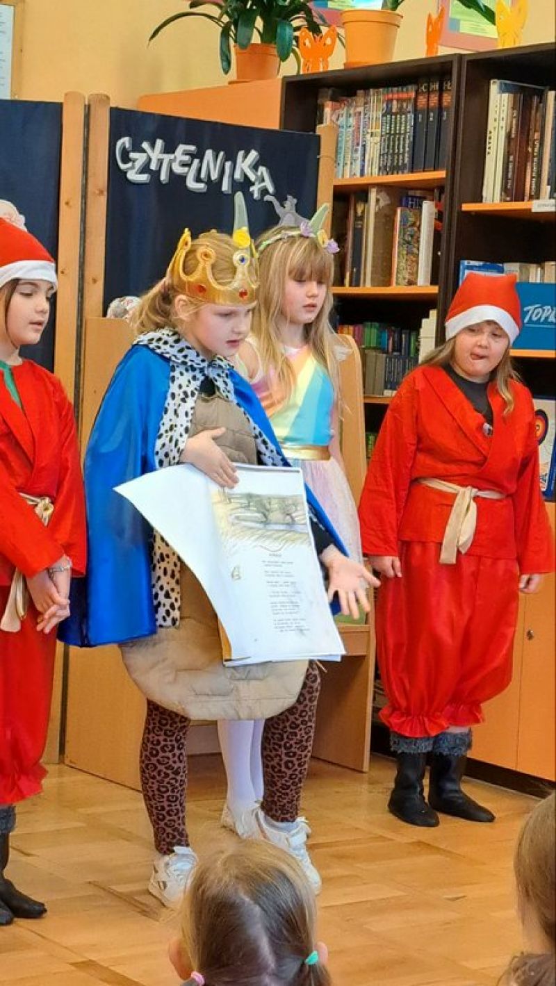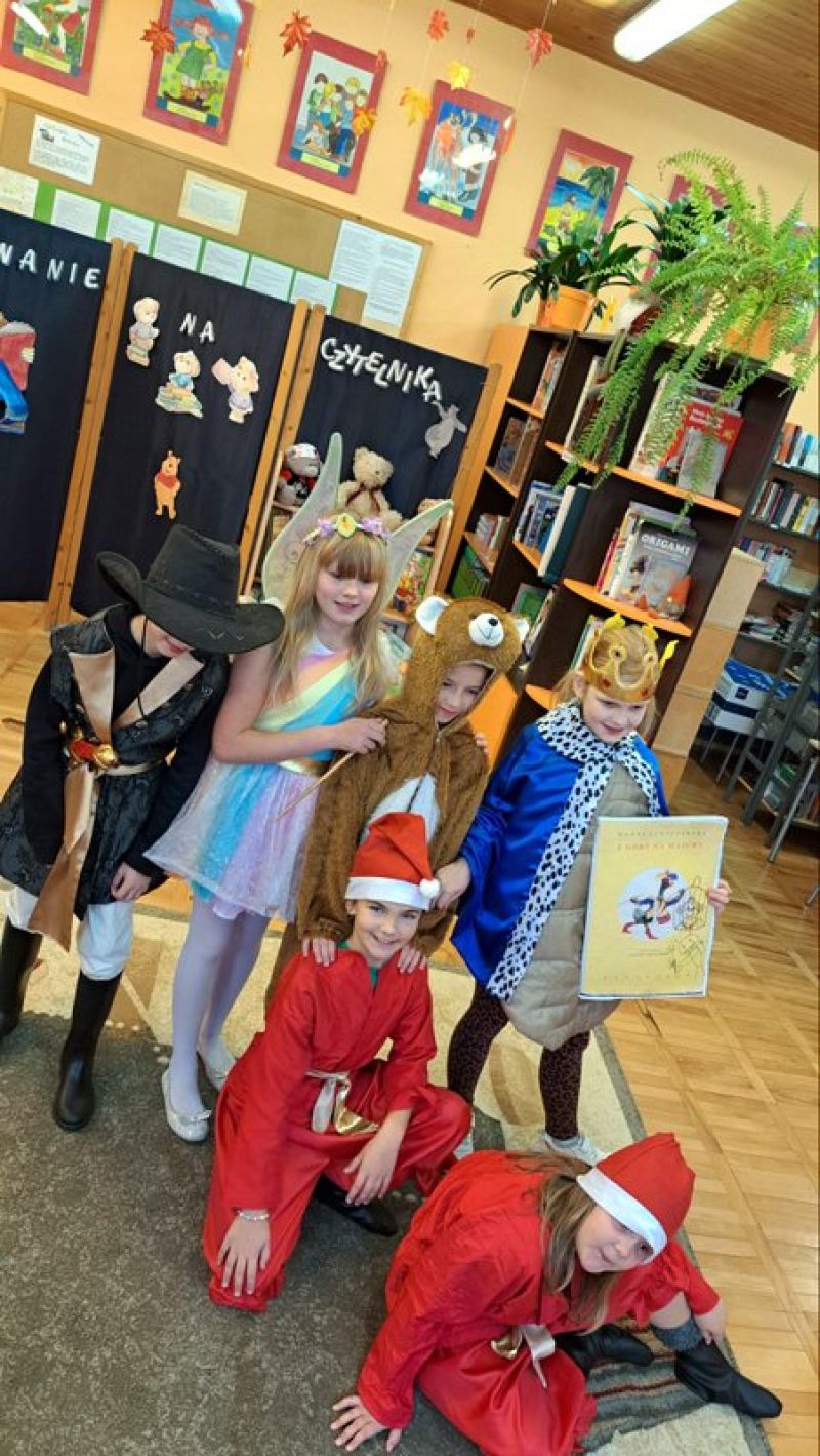 W tym szczególny dniu, w naszej bibliotece odbyło się pasowanie na czytelników uczniów klas pierwszych. Pani Małgorzata Zawadzka wraz z uczniami kl. 3a przygotowała dla najmłodszych czytelników niespodziankę-krótkie bajkowe przedstawienie pt. „Życzenia książki”. Piękne kostiumy, a przede wszystkim wspaniała gra aktorska to przepis na oczarowanie widowni, która nagrodziła artystów gromkimi brawami. Pierwszaki już wiedzą, że czytanie to najlepszy sposób na nudę. Dzięki książkom mogą przenieść się do zupełnie innego świata i przeżyć fantastyczne przygody. Wiedzą, jak należy korzystać