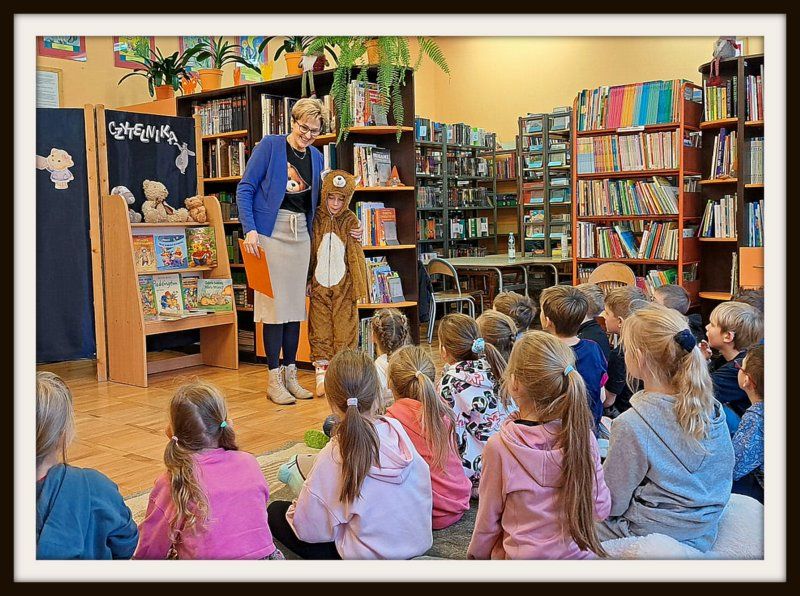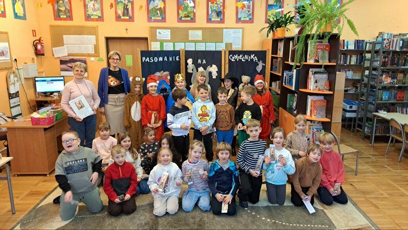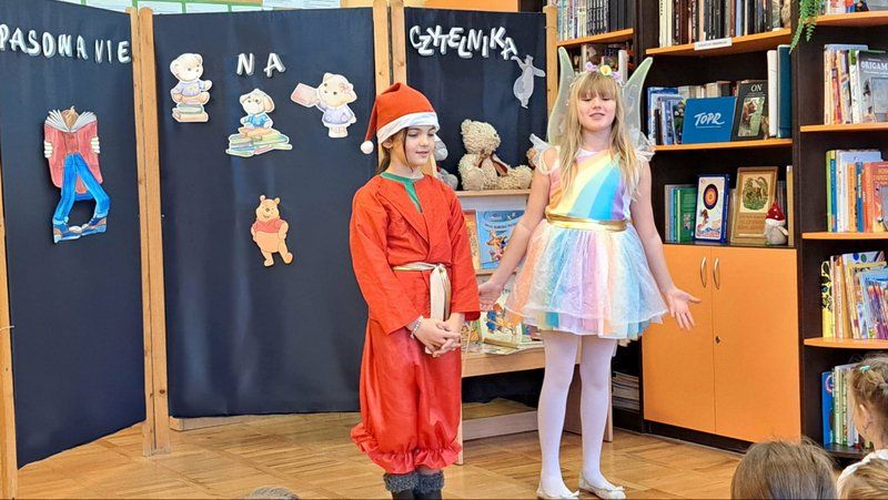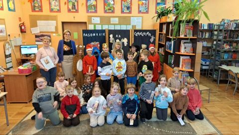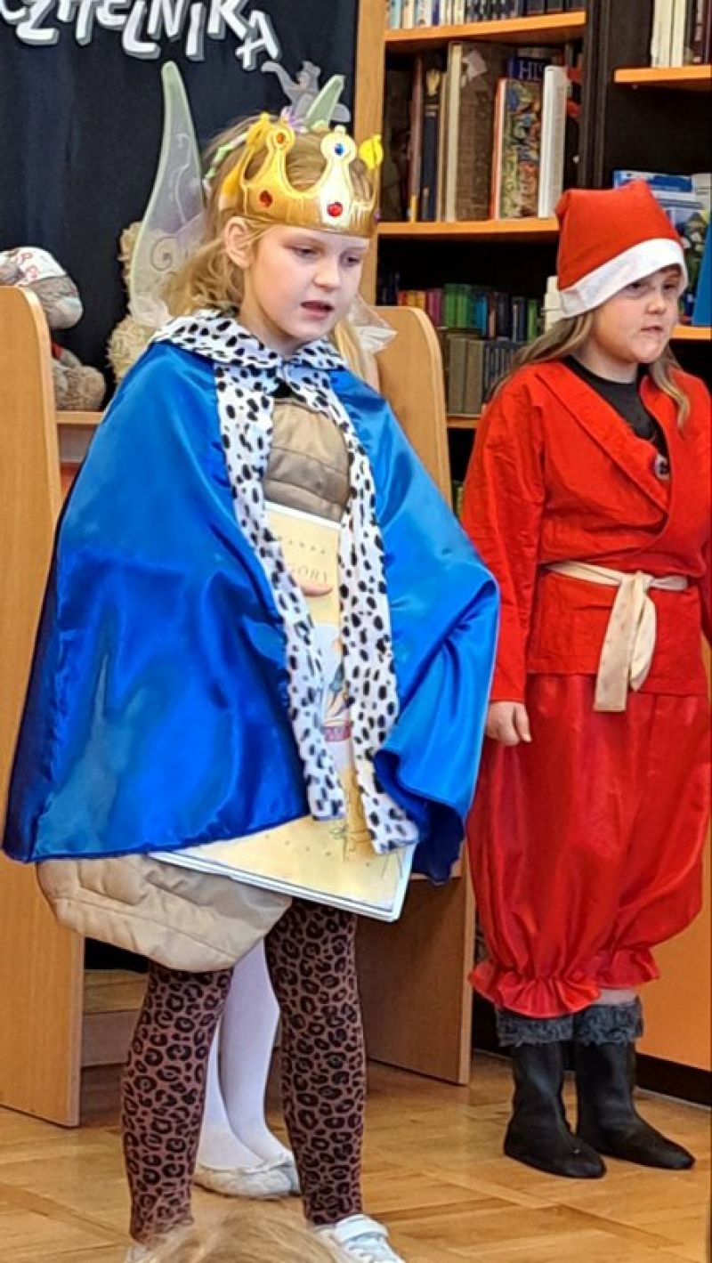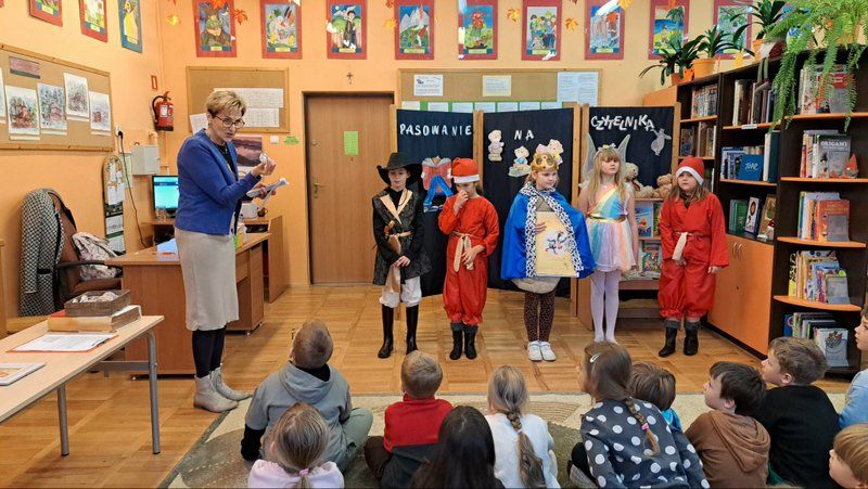W tym szczególny dniu, w naszej bibliotece odbyło się pasowanie na czytelników uczniów klas pierwszych. Pani Małgorzata Zawadzka wraz z uczniami kl. 3a przygotowała dla najmłodszych czytelników niespodziankę-krótkie bajkowe przedstawienie pt. „Życzenia książki”. Piękne kostiumy, a przede wszystkim wspaniała gra aktorska to przepis na oczarowanie widowni, która nagrodziła artystów gromkimi brawami. Pierwszaki już wiedzą, że czytanie to najlepszy sposób na nudę. Dzięki książkom mogą przenieść się do zupełnie innego świata i przeżyć fantastyczne przygody. Wiedzą, jak należy korzystać