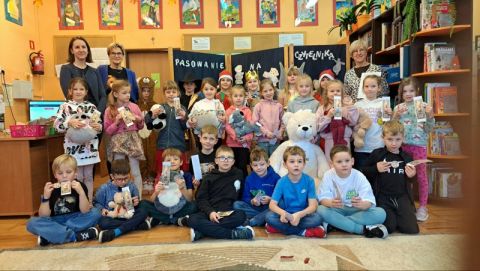 Po uroczystym przyrzeczeniu wszyscy uczniowie klas 1a, 1b i 1c zostali uroczyście przyjęci w poczet czytelników biblioteki szkolnej. Na pamiątkę uroczystości uczniowie otrzymali okolicznościowy dyplom dla klasy oraz wykonane zakładki do książki i przypinki –młodego czytelnika. Na koniec spotkania, uczestnicy mogli poczęstować się słodkimi pierniczkami, którymi obdarowywał wesoły niedźwiadek.
