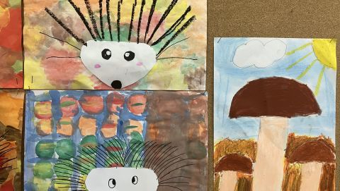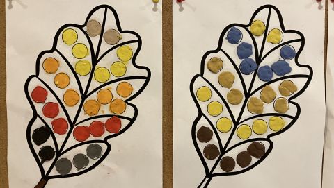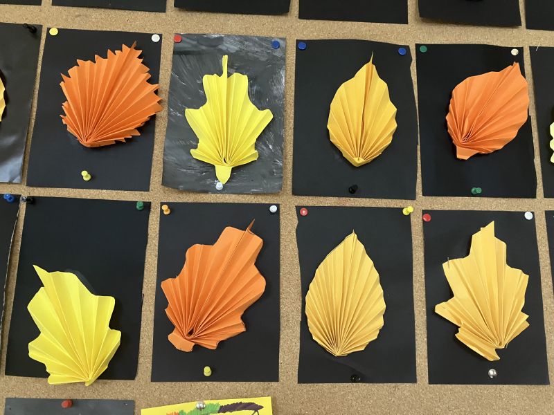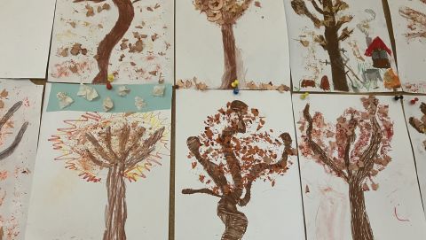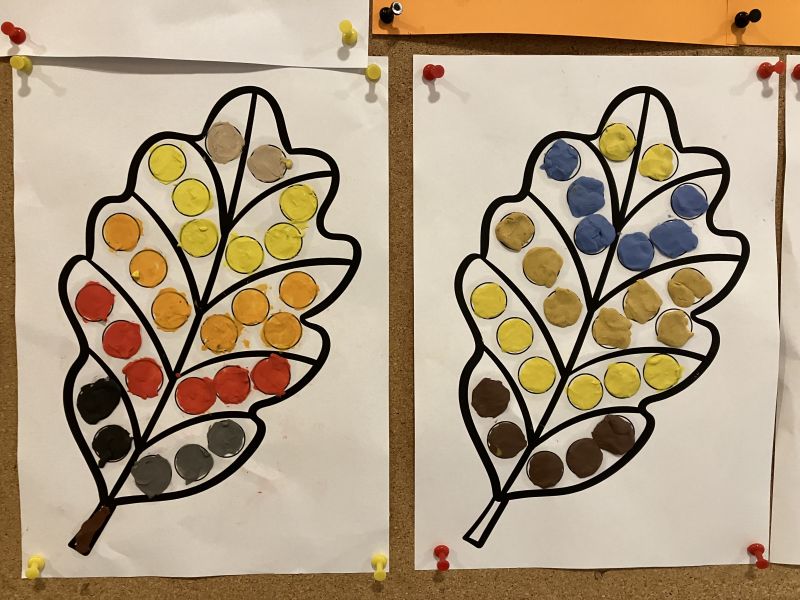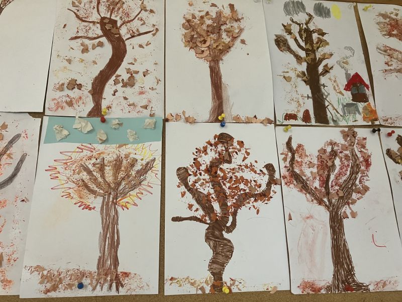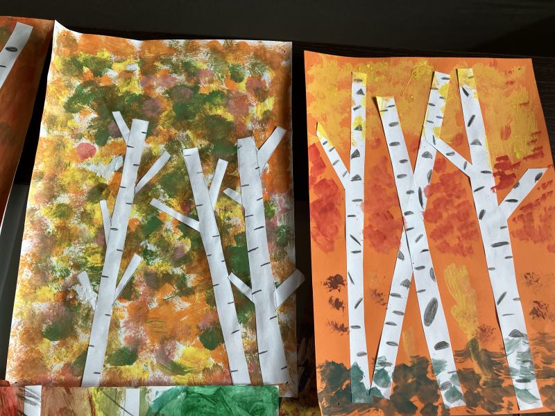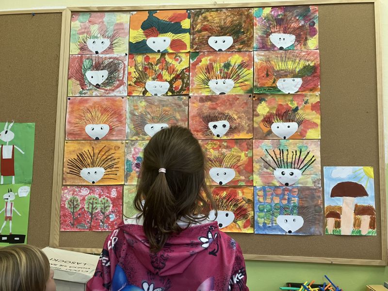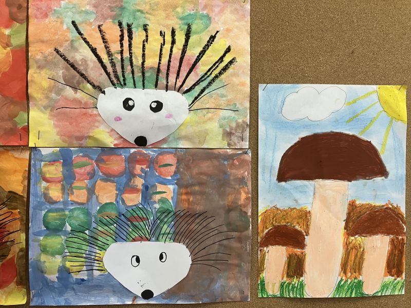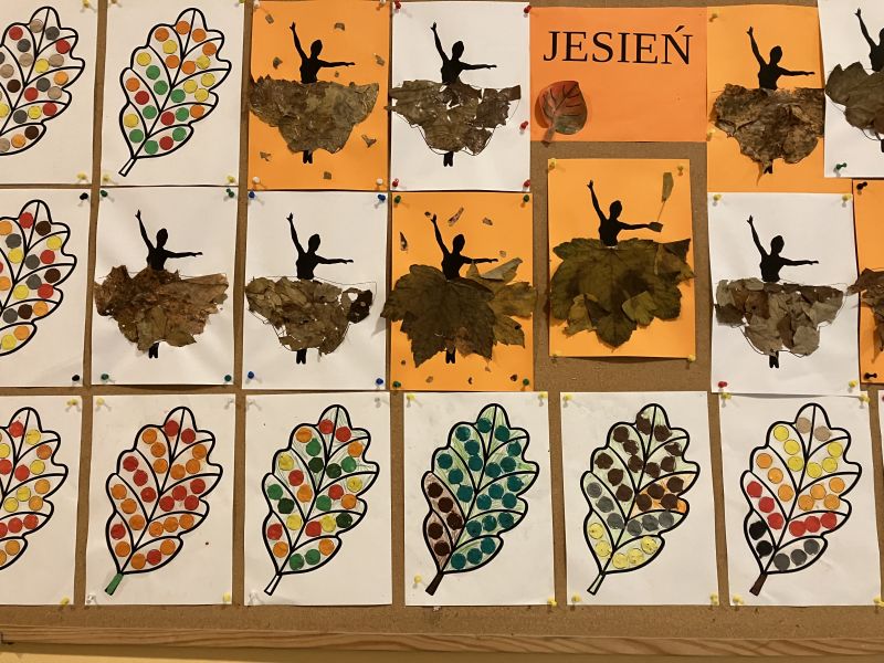 Także na placu zabaw zrobiło się kolorowo. Dzieci bawią się wesoło rozgrzebując i rzucając liście. Zbierają te najpiękniejsze i wykorzystują je w pracach plastycznych. W ruch poszły farby, nożyczki, papiery kolorowe i kleje. Uczniowie eksperymentowali mieszając różne farby i tworzyli barwy jesieni.